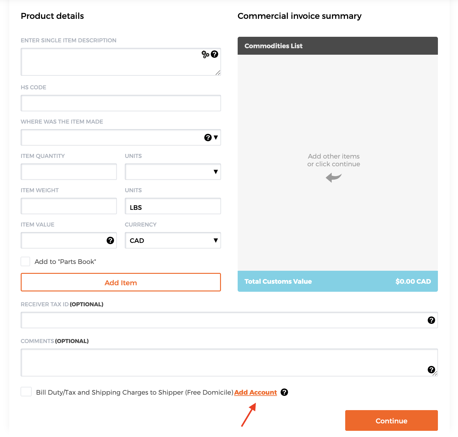 - Add your UPS account number by clicking on “Add Account” – screenshot below) when generating your commercial invoice. You’ll need your UPS account number, the postal code associated with your account and the name on the account — all 3 need to match exactly with how your account is set up with UPS.